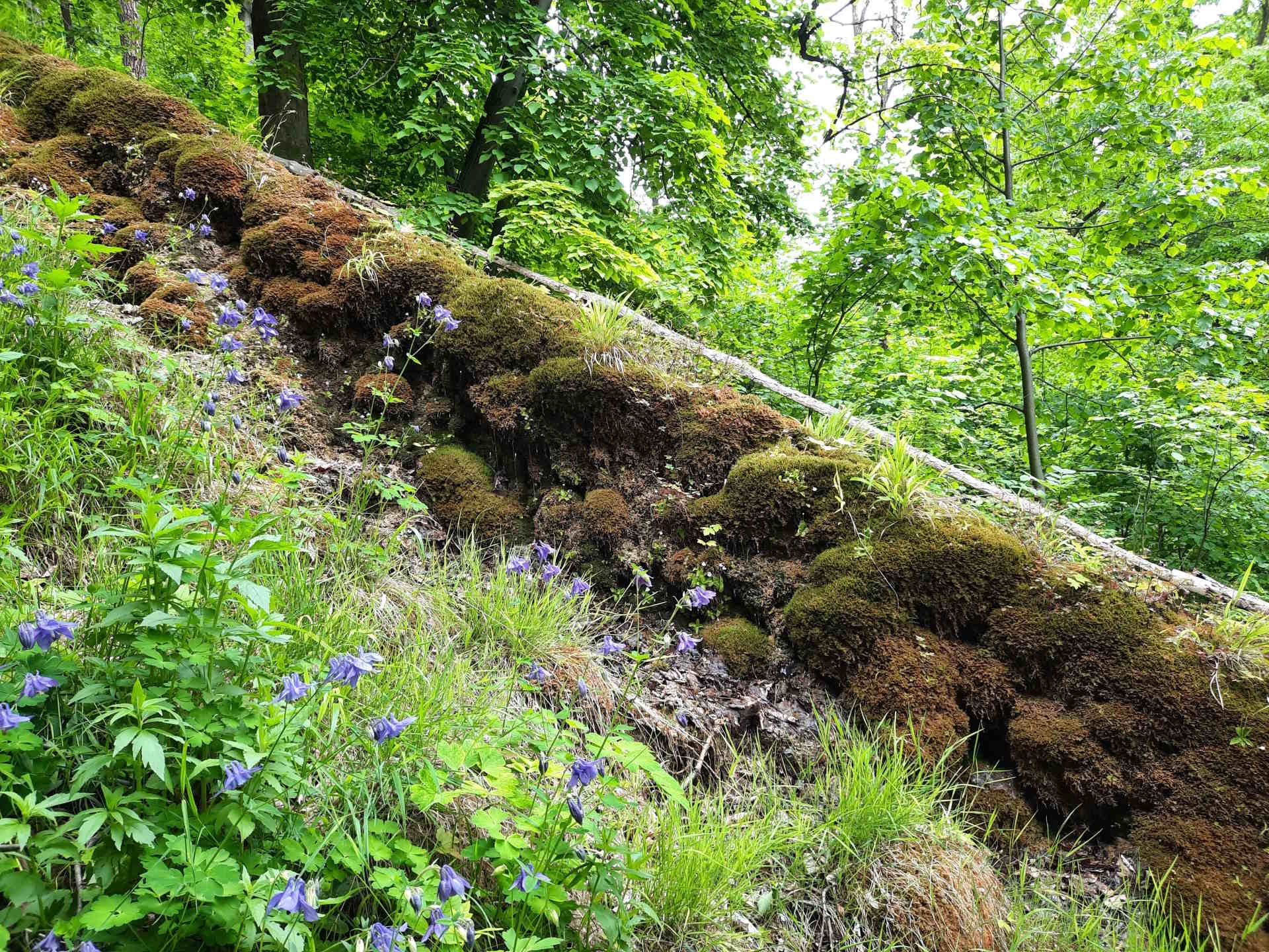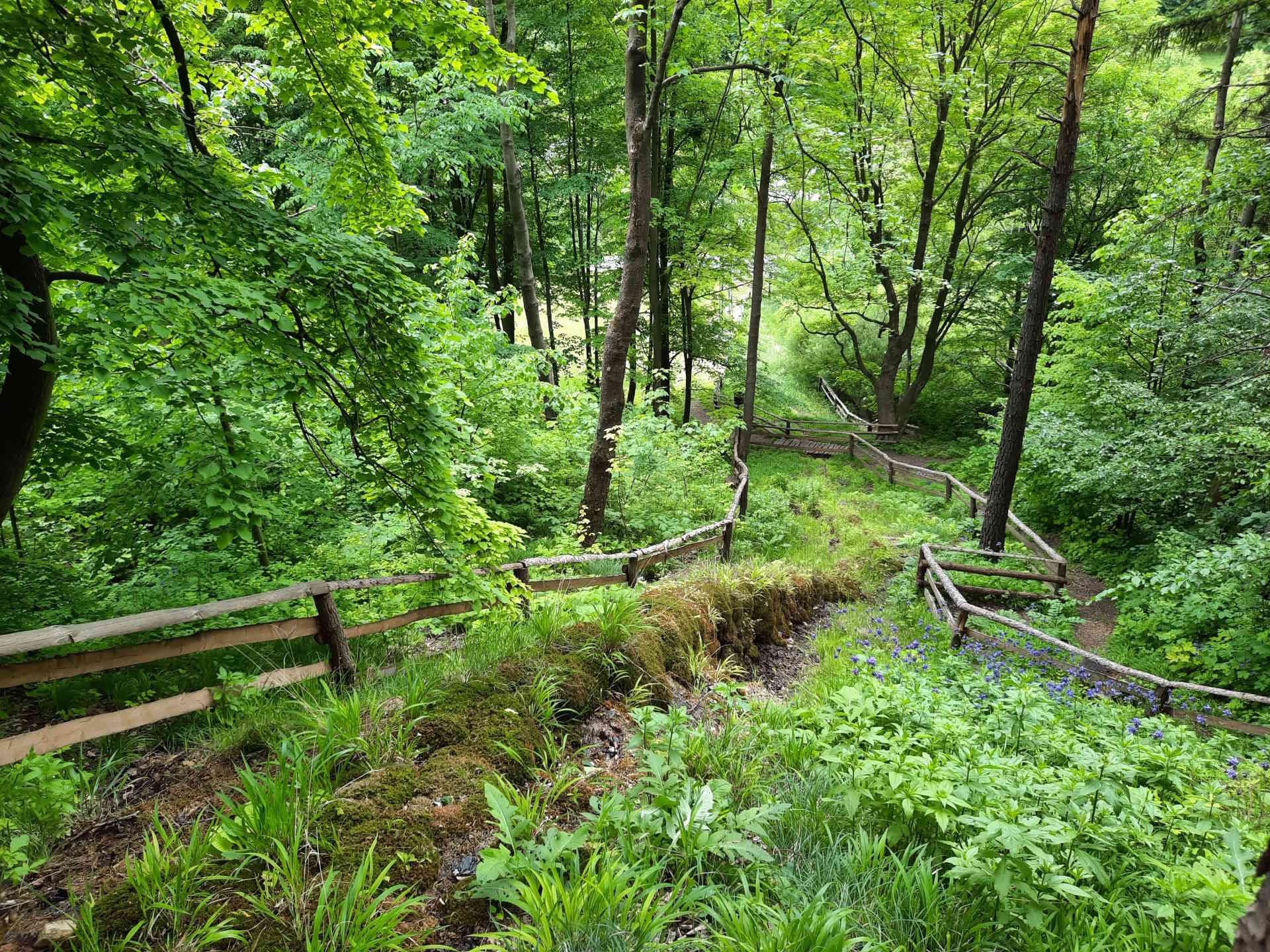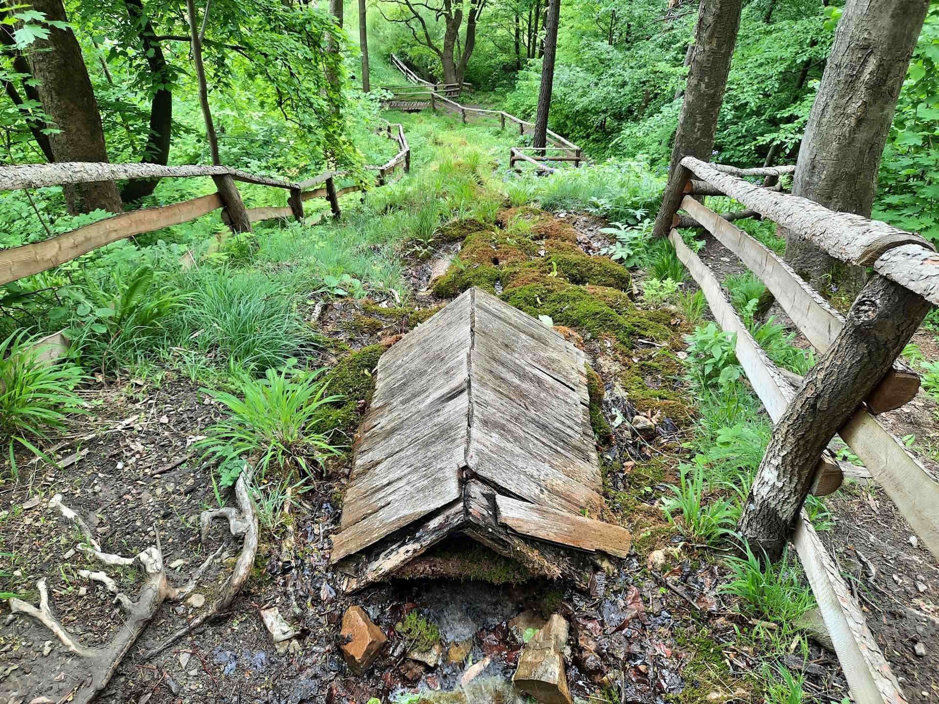 Podloží potůčku vyvýšeného až 120 cm nad okolní terén tvoří travertin s mělkým korytem na vrcholu.