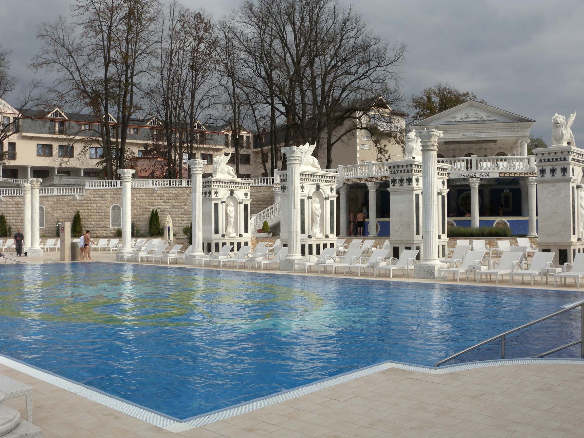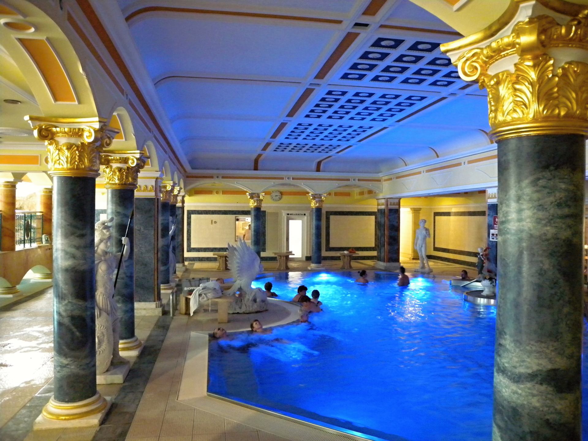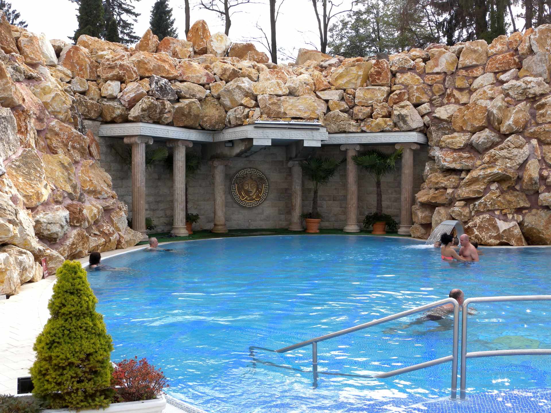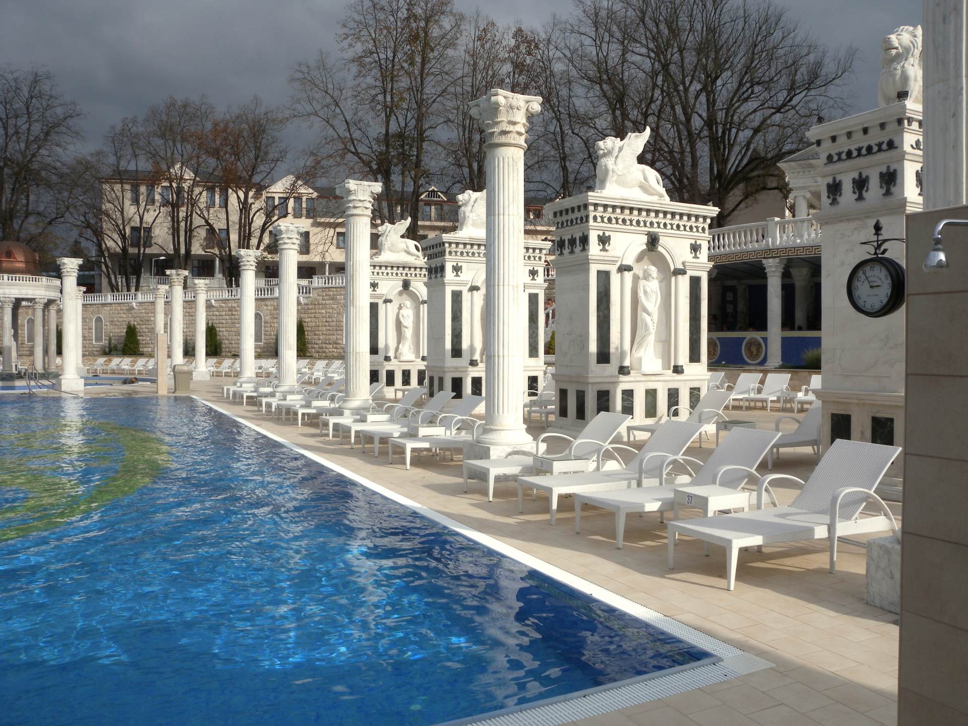 Do bazénu můžete vstoupit po schodech z venku, ale dostanete se tam i z vnitřního bazénu. Lidé, kteří rádi plavou než se vyhřívají v teplé vodě využijí Rekreační plavecký bazén, který je dlouhý 25 m, s vodou teplou 26-28° C. Příjemný dojem celého areálu vytváří velkolepá antická architektura prostorů, ve kterých se bazény nacházejí.