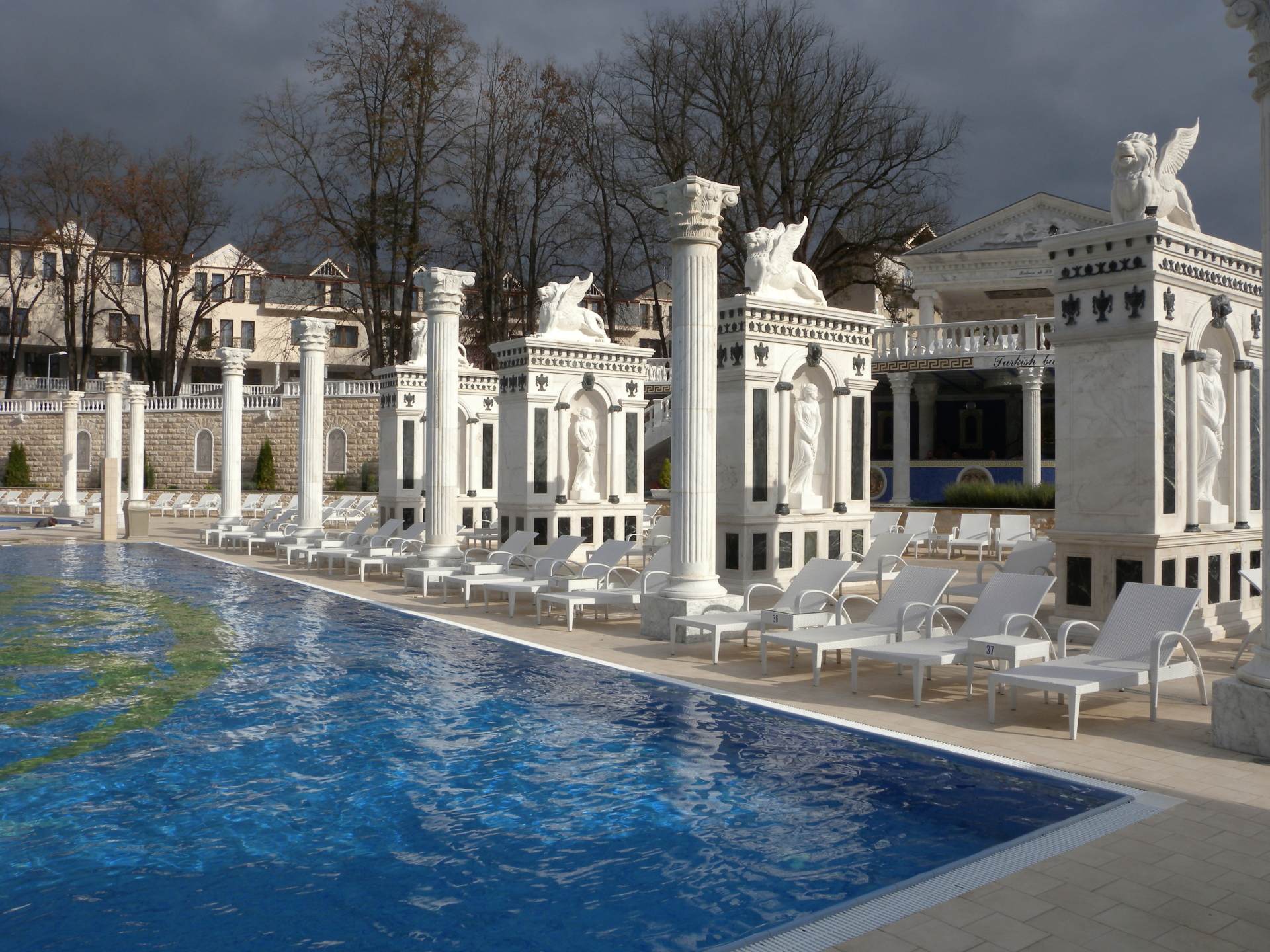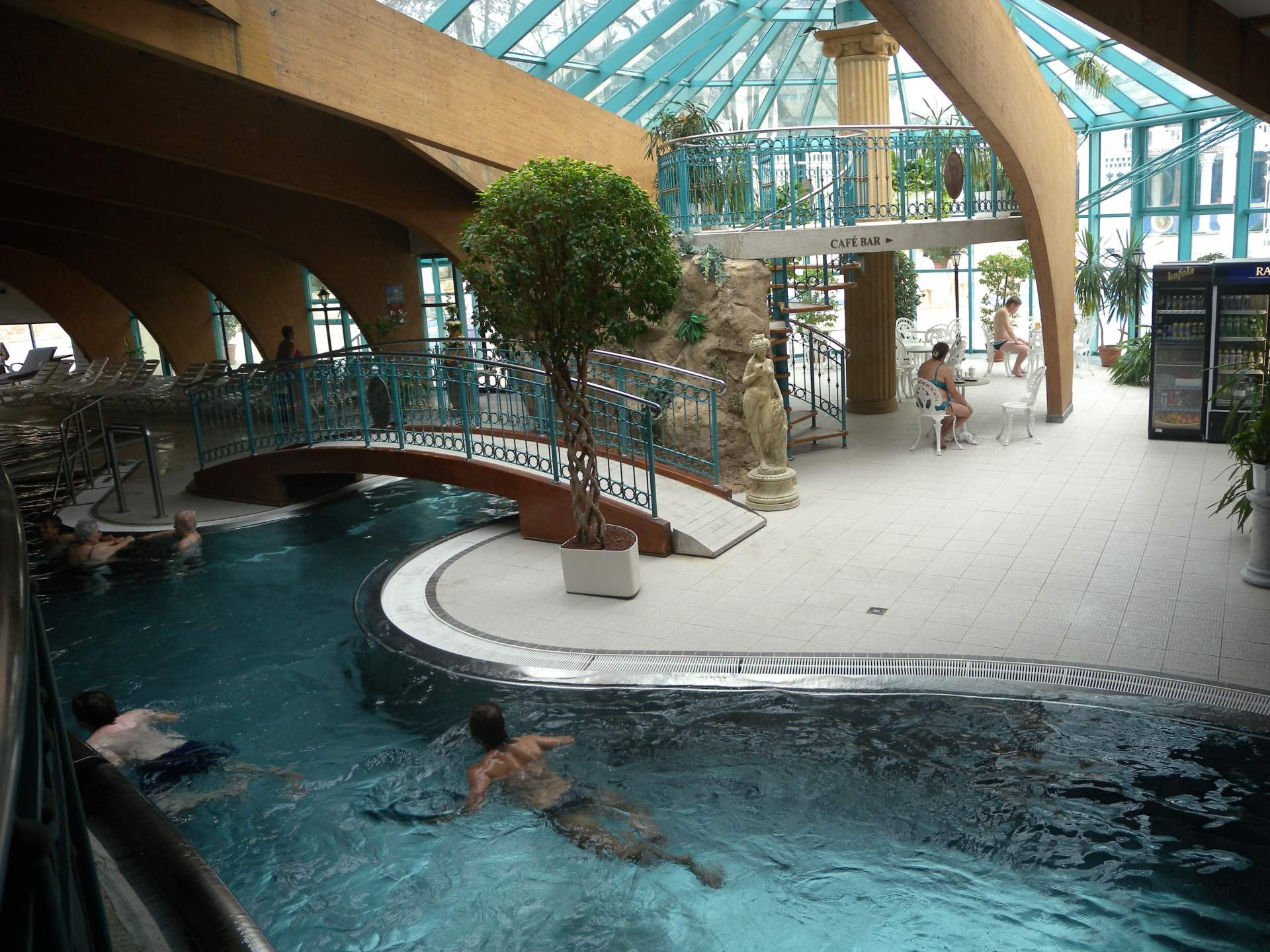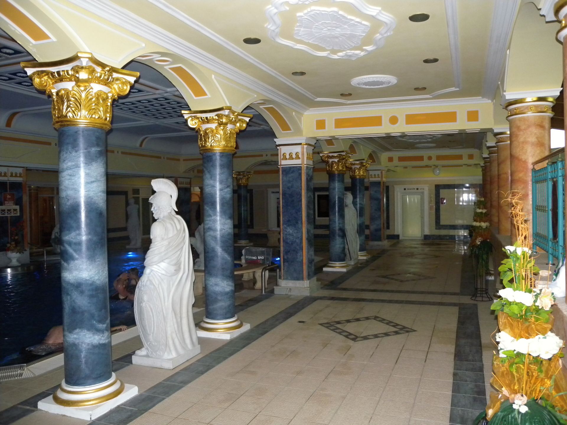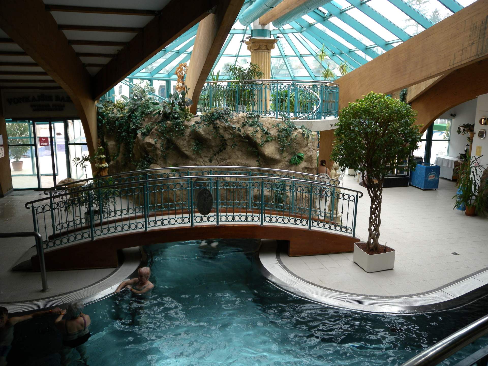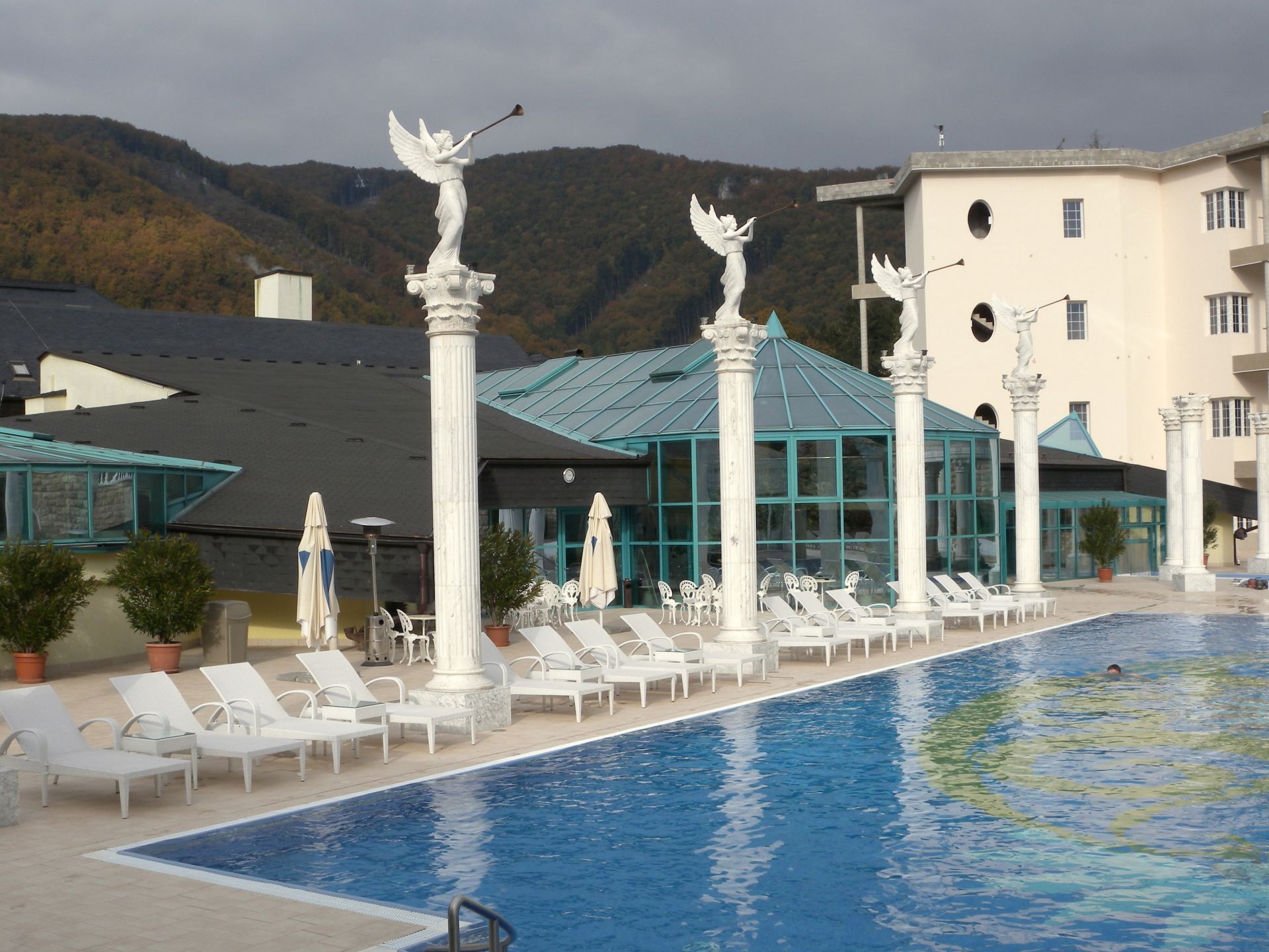 Do bazénu můžete vstoupit po schodech z venku, ale dostanete se tam i z vnitřního bazénu. Lidé, kteří rádi plavou než se vyhřívají v teplé vodě využijí Rekreační plavecký bazén, který je dlouhý 25 m, s vodou teplou 26-28° C. Příjemný dojem celého areálu vytváří velkolepá antická architektura prostorů, ve kterých se bazény nacházejí.