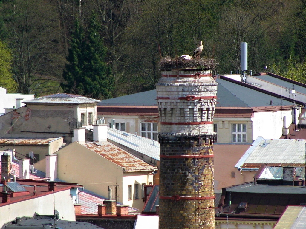 Čápi na komíně v pivovaru.